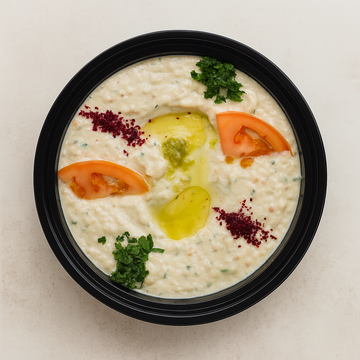 Roasted eggplant mixed with parsley, lemon juice, and olive oil.Β