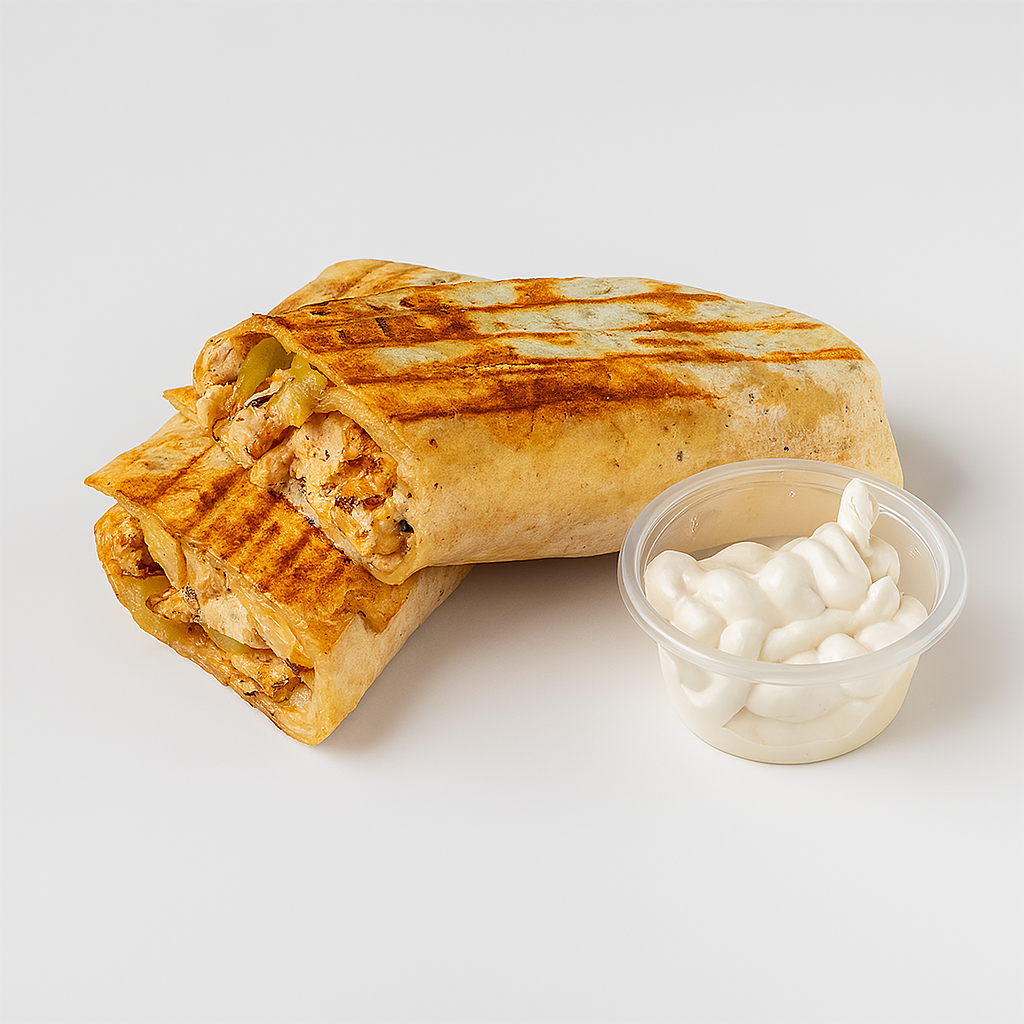 Grilled chicken kabob with pickles & garlic sauce .
