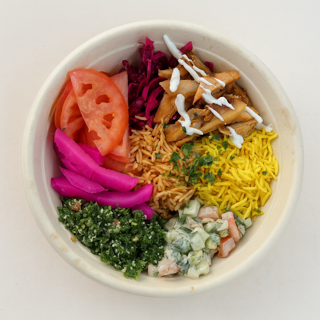 Marinated chicken shawarma, 4 toppings & garlic sauce.