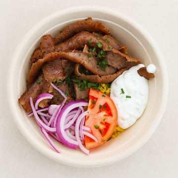 Gyro meat over rice or salad, 4 toppings & tzatziki sauce.