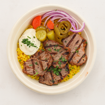Grilled steak kabob, 4 toppings & tahini sauce.
