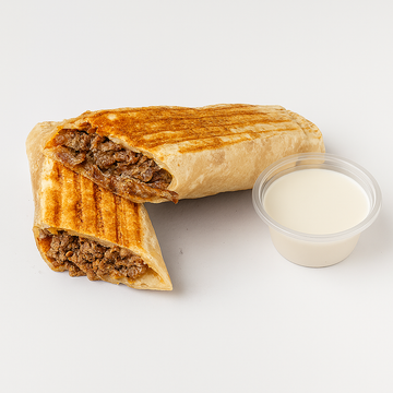 Beef shawarma with tomato, onion, parsley & tahini sauce.
