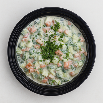 Tomato, cucumber, lemon, parsley, and tahini. A creamy, tangy mix.
